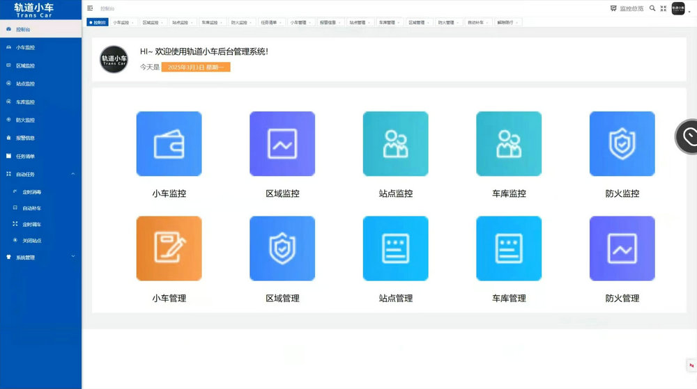 功能:小车监控、站点监控、区域监控、防火监控、小车管理、站点管理、区域管理、防火单元管理;可查询站点历史信息,包括发/来车记录、调车记录、到站记录、可实时观测行车轨迹等系统化功能;